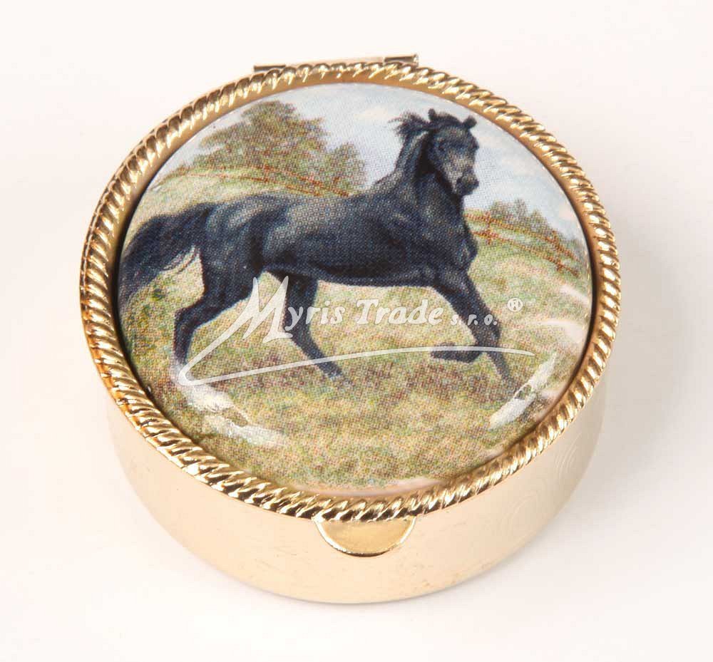 klasická kulatá lékovka je vyrobena z kovu zlaté barvy s porcelánovým víčkem s motivem koňů