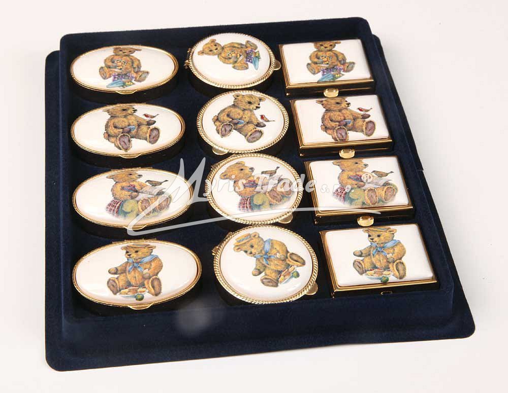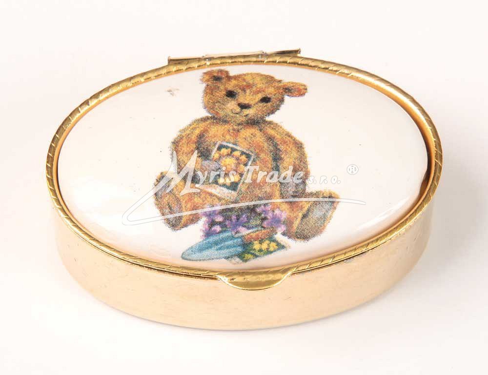 klasická oválná lékovka je vyrobena z kovu zlaté barvy s porcelánovým víčkem s motivem medvídků (ve čtyřech různých podobách)