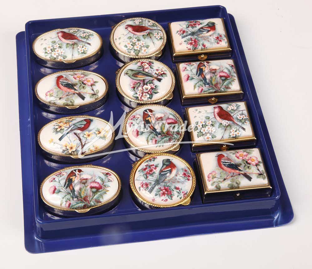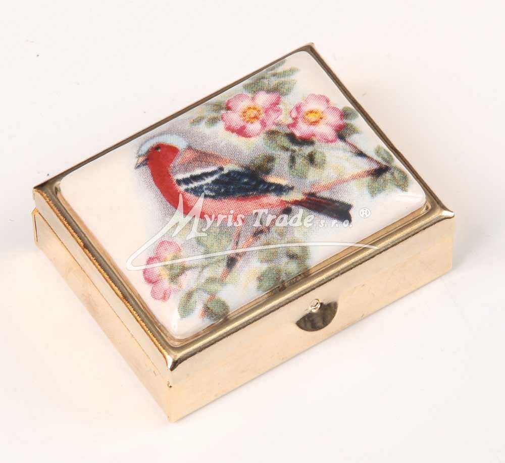 klasická obdélníková lékovka je vyrobena z kovu zlaté barvy s porcelánovým víčkem s motivem ptáčků