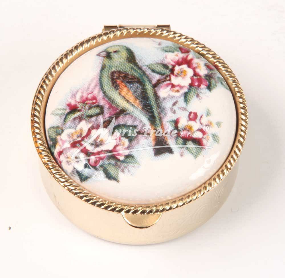 klasická kulatá lékovka je vyrobena z kovu zlaté barvy s porcelánovým víčkem s motivem ptáčků