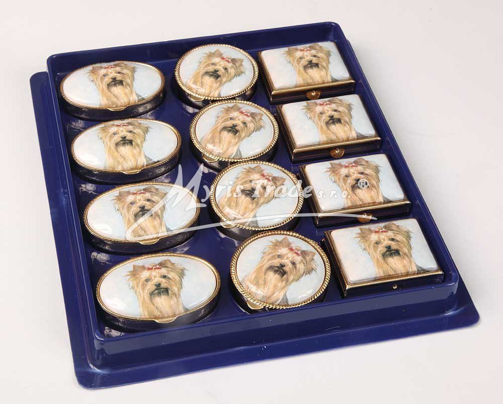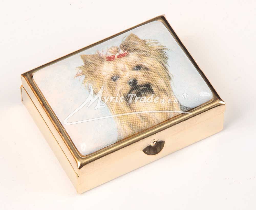 klasická obdélníková lékovka je vyrobena z kovu zlaté barvy s porcelánovým víčkem s motivem hlavy yorkshira