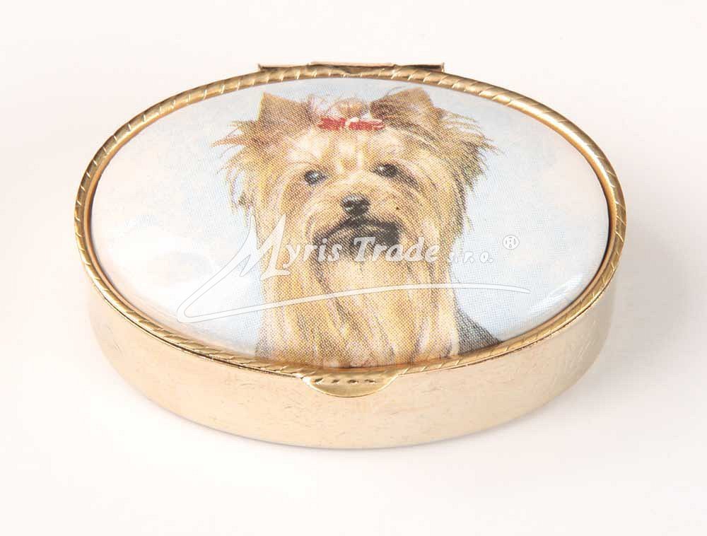 klasická oválná lékovka je vyrobena z kovu zlaté barvy s porcelánovým víčkem s motivem hlavy yorkshira