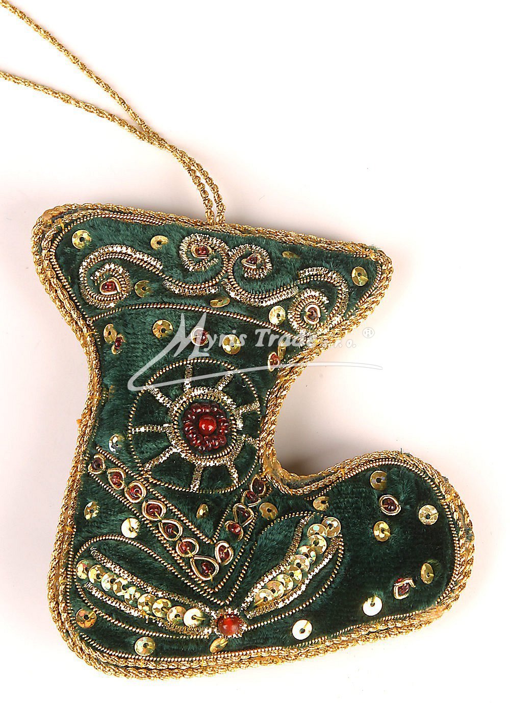 Ručně pošívaná textilní vánoční ozdoba. Tato typická vánoční ozdoba je vyrobena z textilu a je bohatě ručně pošitá drobnými korálky, flitry a kovovým drátkem ve zlaté barvě.
