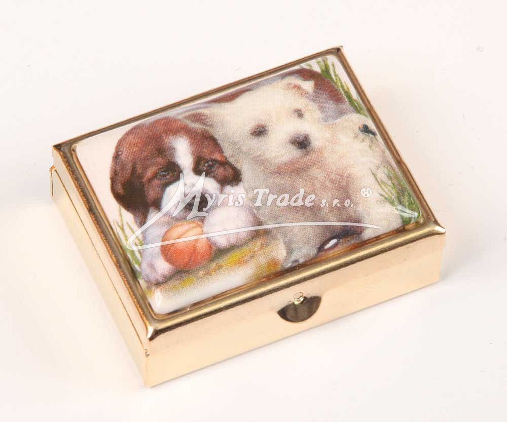 klasická obdélníková lékovka je vyrobena z kovu zlaté barvy s porcelánovým víčkem s motivem hrajících si štěňátek