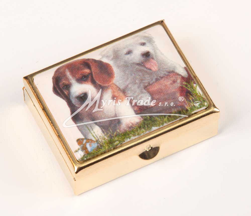 klasická obdélníková lékovka je vyrobena z kovu zlaté barvy s porcelánovým víčkem s motivem hrajících si štěňátek