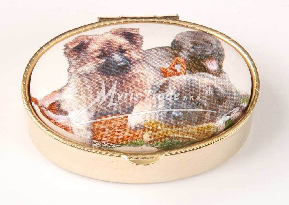 klasická oválná lékovka je vyrobena z kovu zlaté barvy s porcelánovým víčkem s motivem hrajících si štěňat