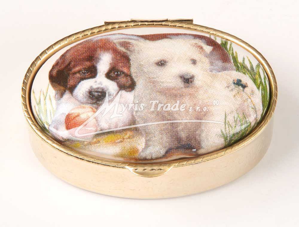 klasická oválná lékovka je vyrobena z kovu zlaté barvy s porcelánovým víčkem s motivem hrajících si štěňat