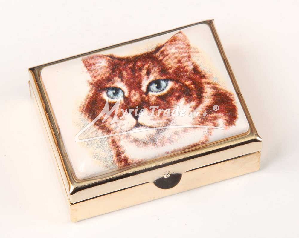 klasická obdélníková lékovka je vyrobena z kovu zlaté barvy s porcelánovým víčkem s motivem hlavy kočičky