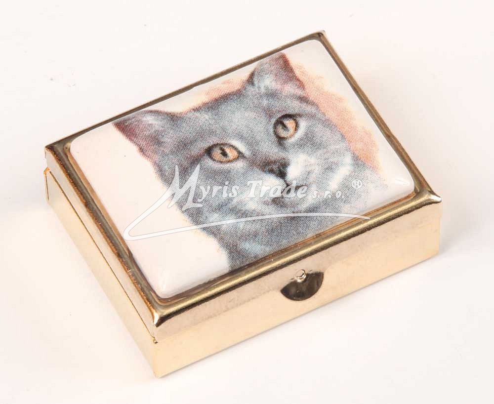 klasická obdélníková lékovka je vyrobena z kovu zlaté barvy s porcelánovým víčkem s motivem hlavy kočičky