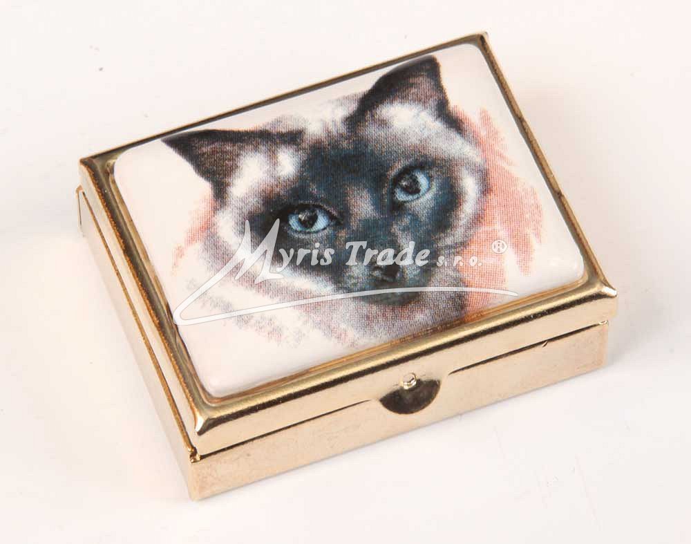 klasická obdélníková lékovka je vyrobena z kovu zlaté barvy s porcelánovým víčkem s motivem hlavy kočičky