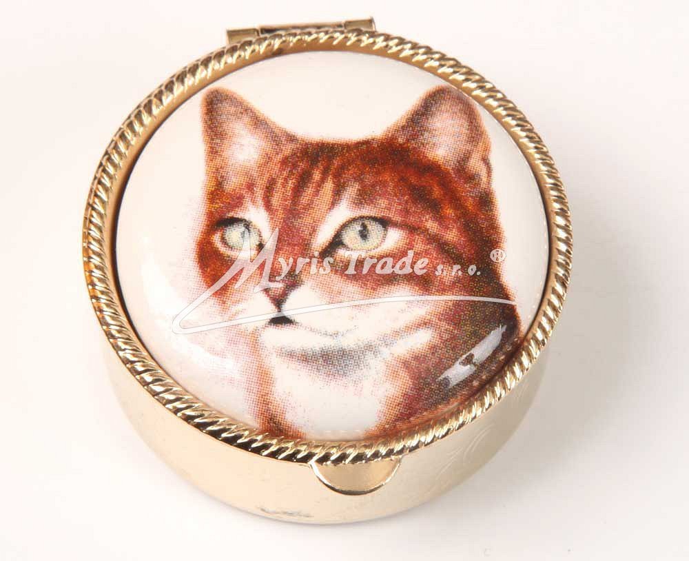 klasická kulatá lékovka je vyrobena z kovu zlaté barvy s porcelánovým víčkem s motivem hlavy kočičky