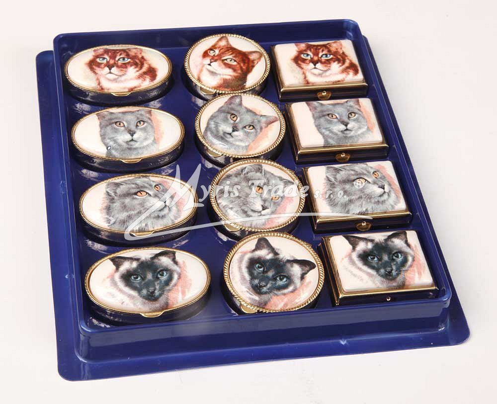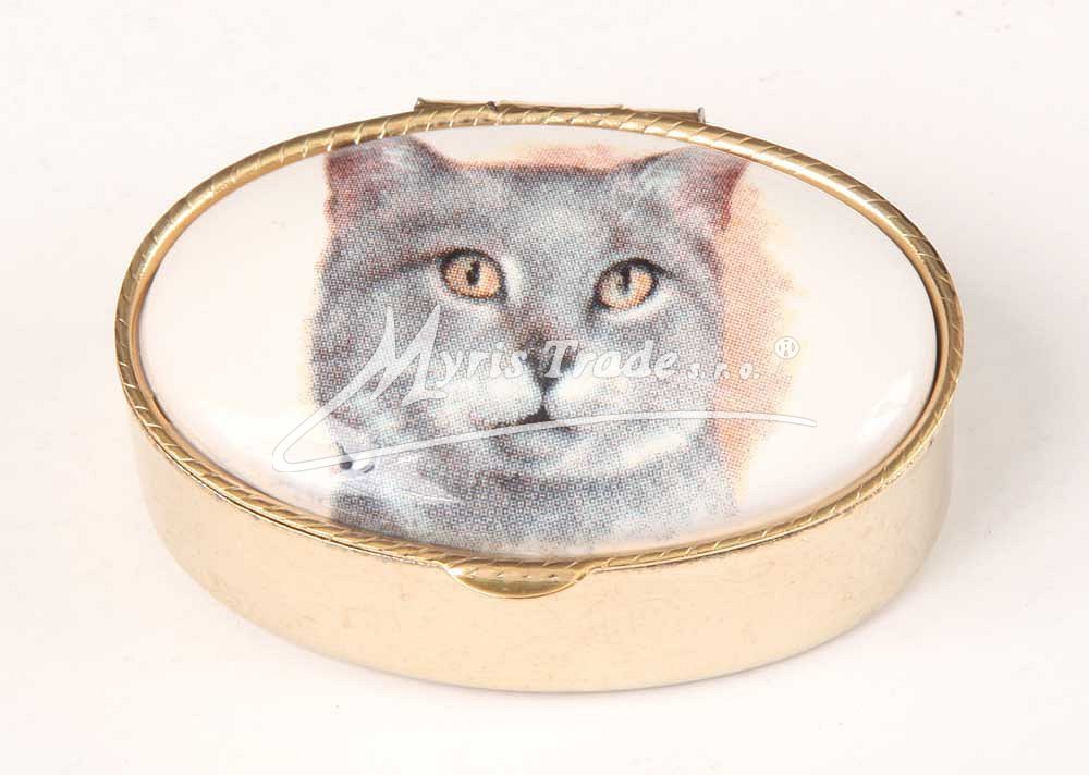 klasická oválná lékovka je vyrobena z kovu zlaté barvy s porcelánovým víčkem s motivem hlavy kočičky