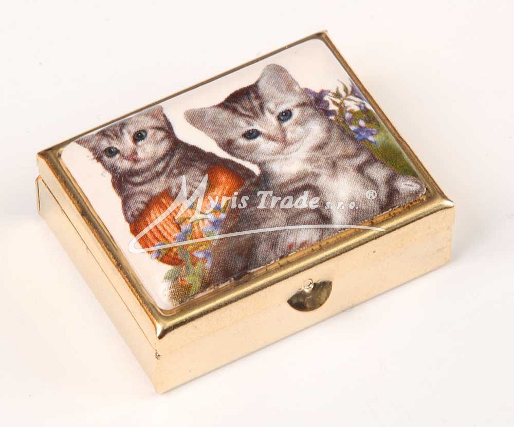 klasická obdélníková lékovka je vyrobena z kovu zlaté barvy s porcelánovým víčkem s motivem dvou kočiček