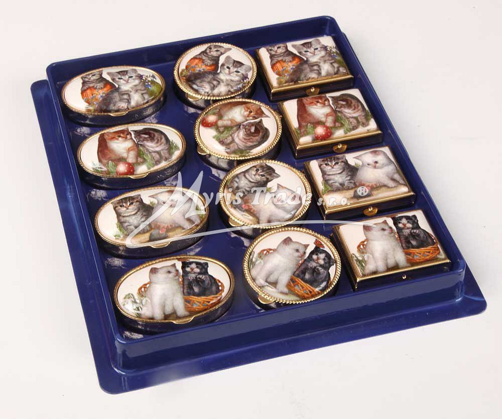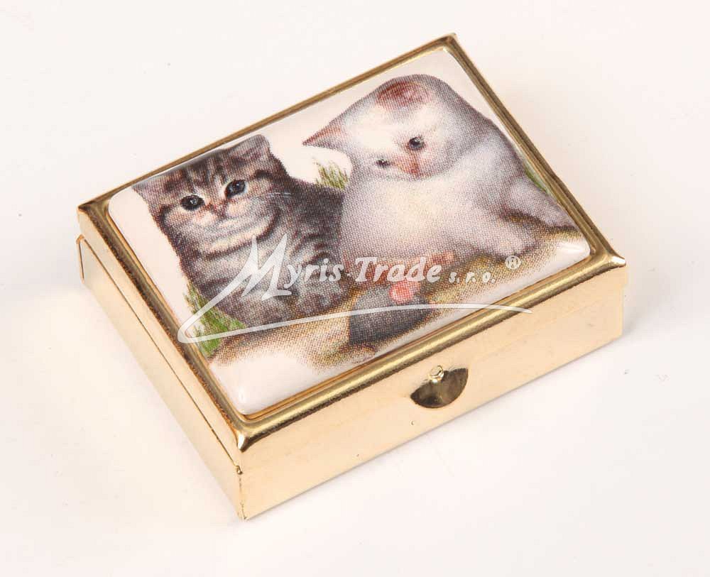 klasická obdélníková lékovka je vyrobena z kovu zlaté barvy s porcelánovým víčkem s motivem dvou kočiček