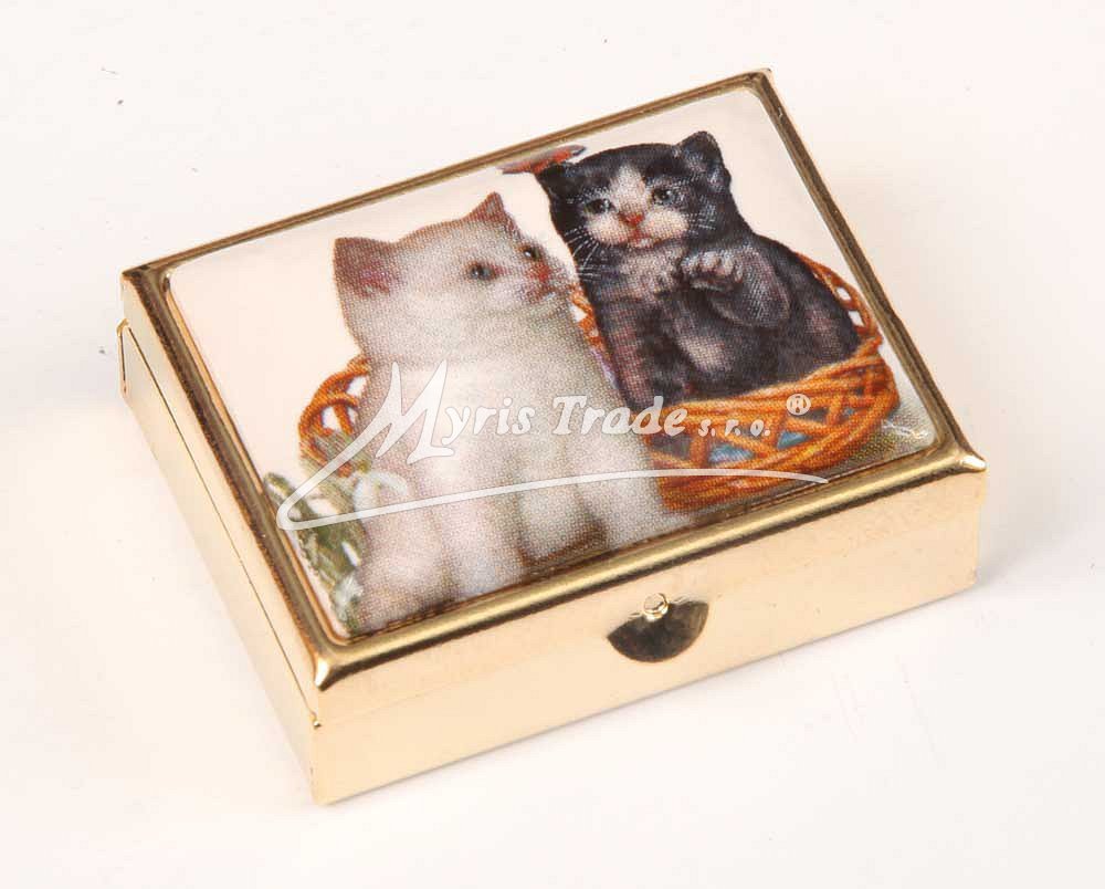 klasická obdélníková lékovka je vyrobena z kovu zlaté barvy s porcelánovým víčkem s motivem dvou kočiček