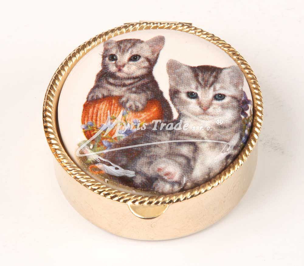 klasická kulatá lékovka je vyrobena z kovu zlaté barvy s porcelánovým víčkem s motivem dvou kočiček