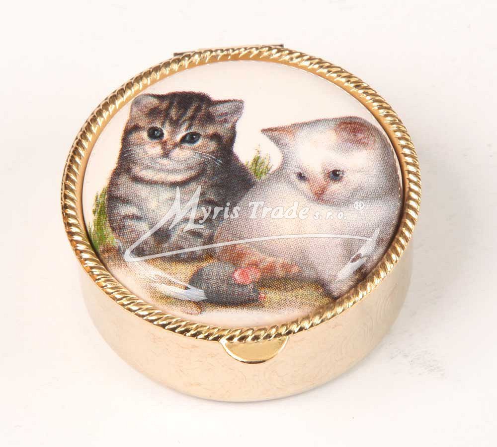 klasická kulatá lékovka je vyrobena z kovu zlaté barvy s porcelánovým víčkem s motivem dvou kočiček