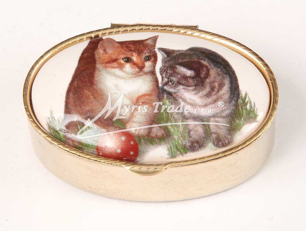 klasická oválná lékovka je vyrobena z kovu zlaté barvy s porcelánovým víčkem s motivem dvou kočiček