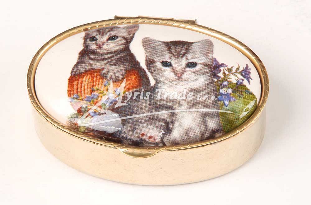 klasická oválná lékovka je vyrobena z kovu zlaté barvy s porcelánovým víčkem s motivem dvou kočiček