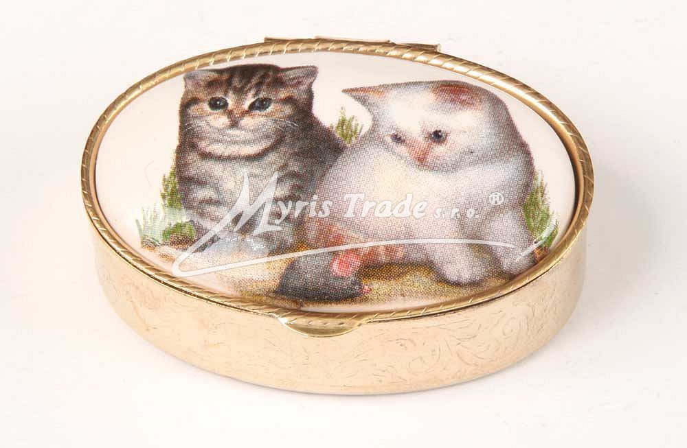 klasická oválná lékovka je vyrobena z kovu zlaté barvy s porcelánovým víčkem s motivem dvou kočiček