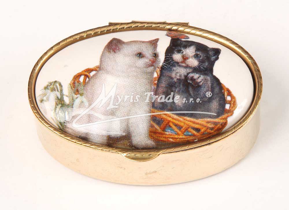 klasická oválná lékovka je vyrobena z kovu zlaté barvy s porcelánovým víčkem s motivem dvou kočiček