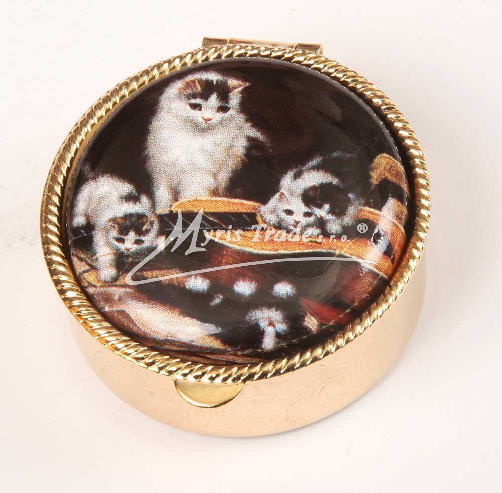 klasická kulatá lékovka je vyrobena z kovu zlaté barvy s porcelánovým víčkem s motivem hrajících si koťat