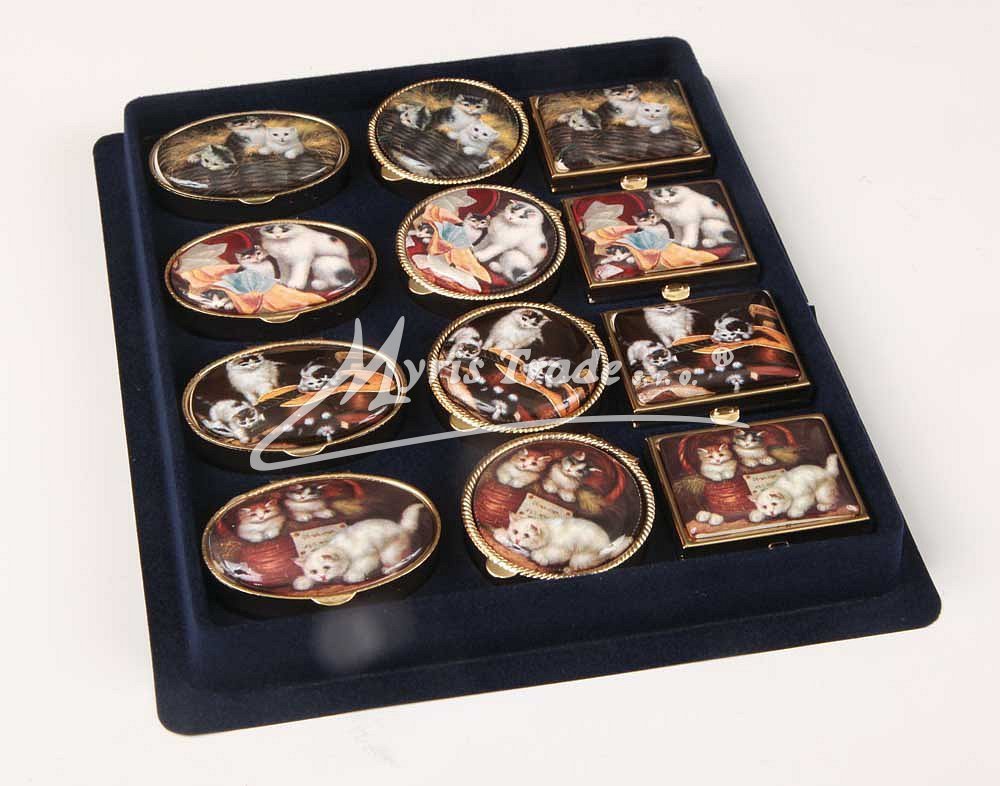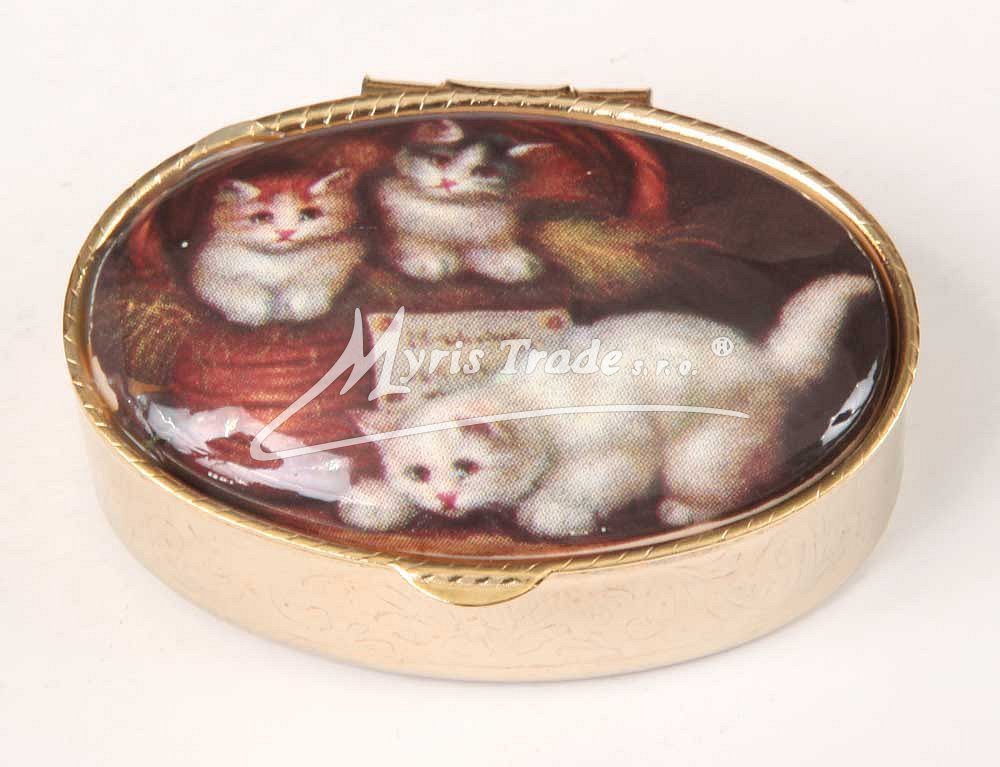 klasická oválná lékovka je vyrobena z kovu zlaté barvy s porcelánovým víčkem s motivem hrajících si koťat