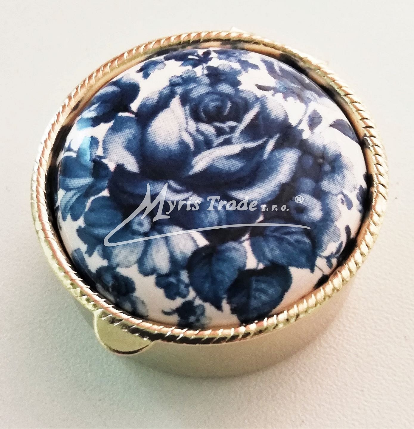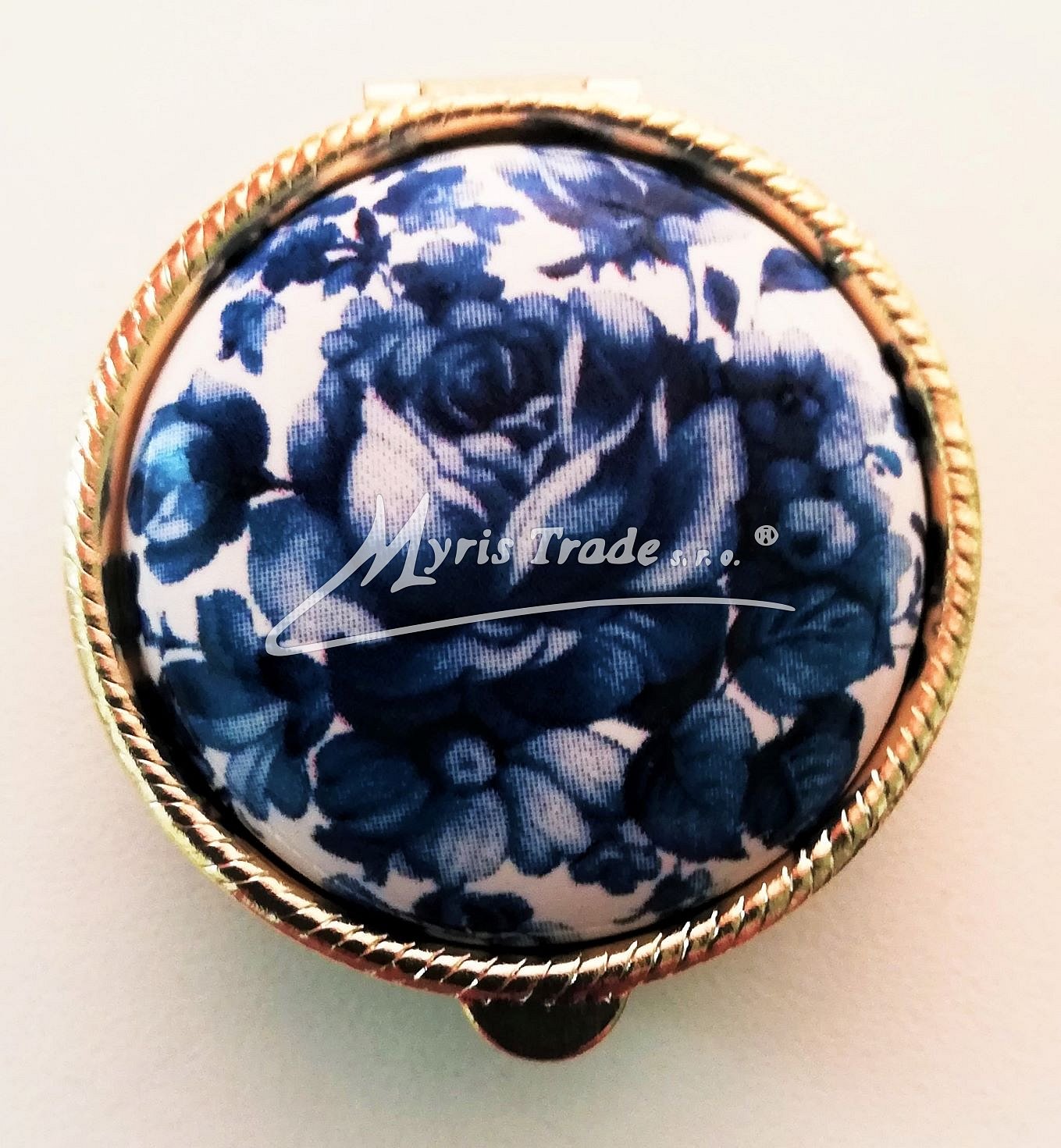 klasická kulatá lékovka je vyrobena z kovu zlaté barvy s porcelánovým víčkem s květinovým motivem