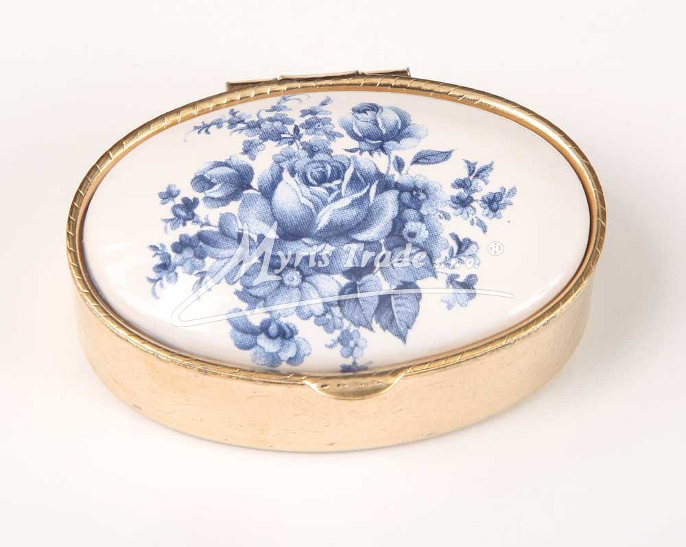 klasická oválná lékovka je vyrobena z kovu zlaté barvy s porcelánovým víčkem s květinovým motivem