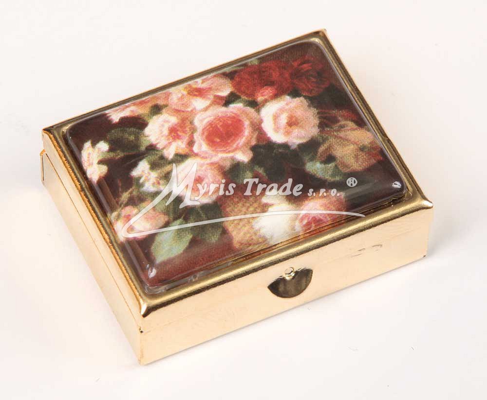 klasická obdélníková lékovka je vyrobena z kovu zlaté barvy s porcelánovým víčkem s květinovým motivem