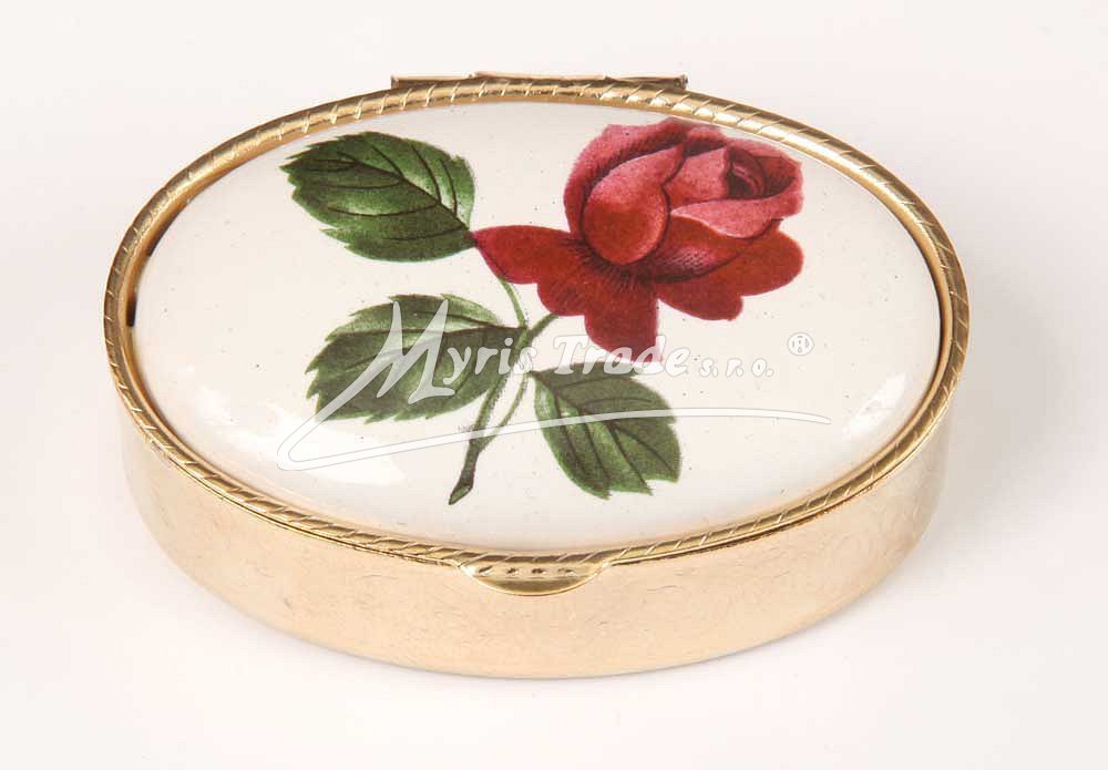 klasická oválná lékovka je vyrobena z kovu zlaté barvy s porcelánovým víčkem s květinovým motivem