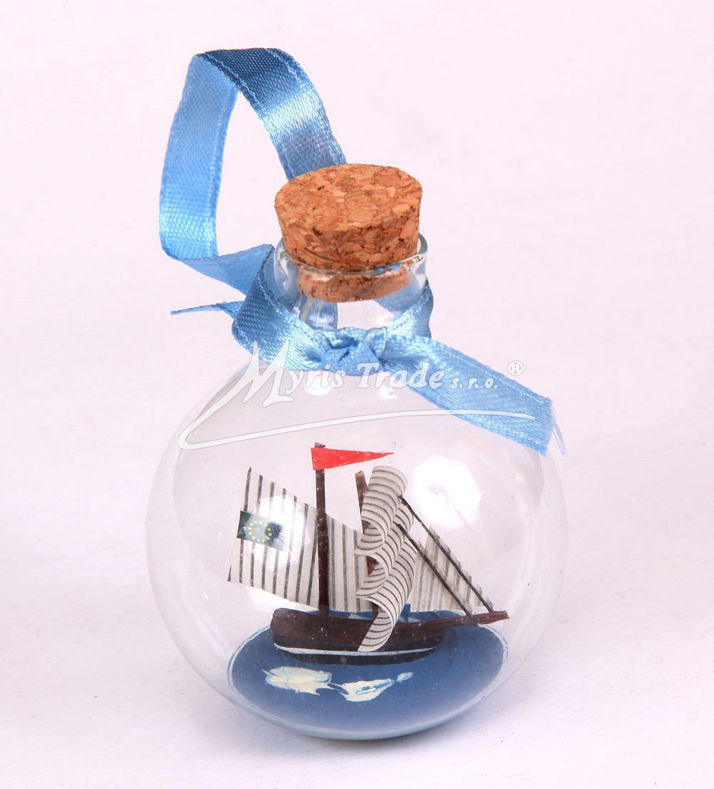 miniaturní model plachetnice uzavřený ve skleněné baňce
