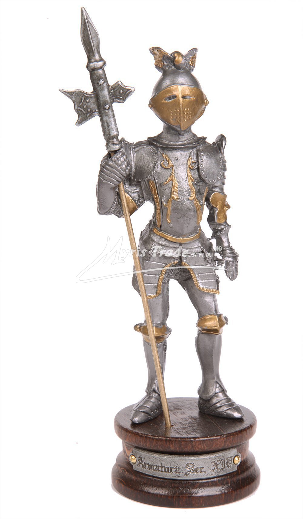 soška rytíře v brnění provedená ve stříbrném kovu s bronzovými ozdobami, na dřevěném podstavci, s kopím