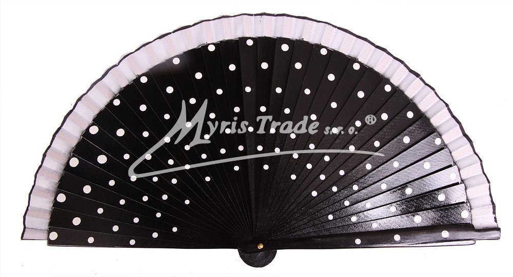 klasický dřevěný vějíř, barevně lakovaný, černý základ s bílými puntíky