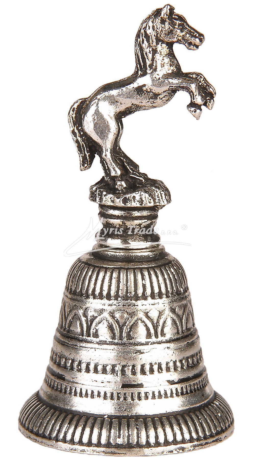 gravírovaný zvoneček s figurkou vzpínajícího se koně, postříbřený