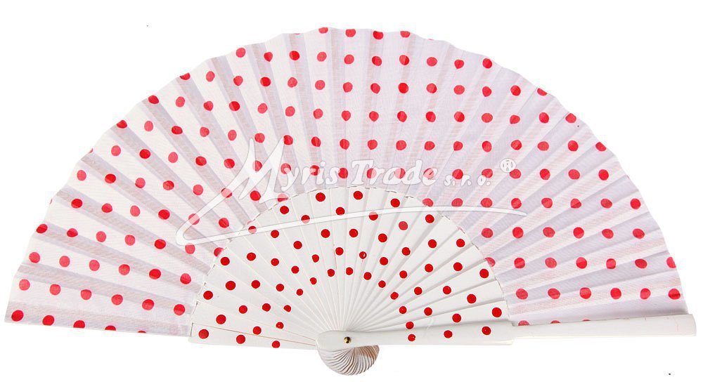 klasický dřevěný vějíř, barevně lakovaný, bílý základ s červenými puntíky