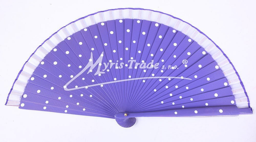 klasický dřevěný vějíř, barevně lakovaný, fialový základ s bílými puntíky