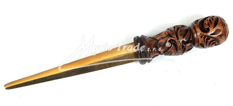 mosazný otvírač na dopisy v ručně vyřezánavou dřevěnou rukojetí