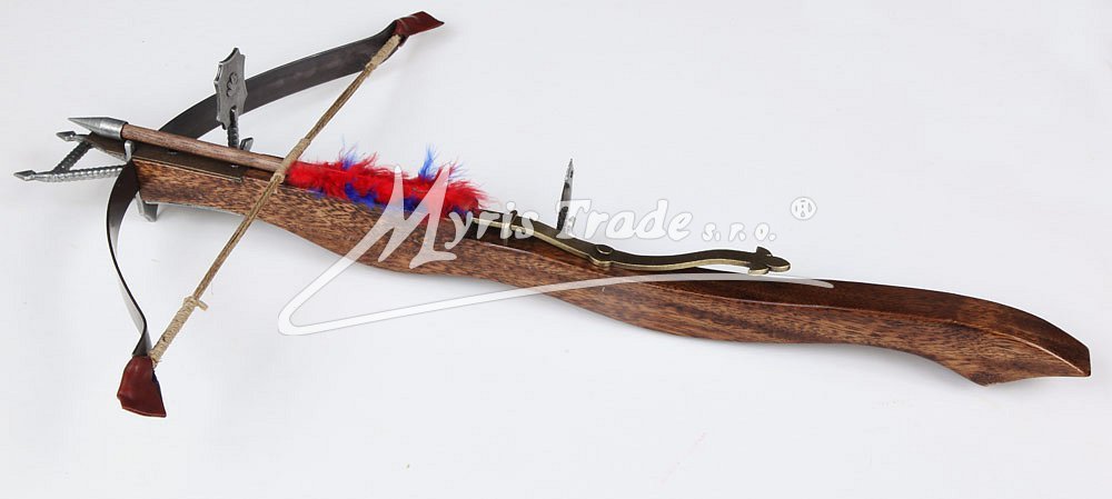 nefunkční replika historické kuše s horním spouštěcím mechanizmem vyrobená ze dřeva a šedého a bronzového kovu s dřevěnou šipkou