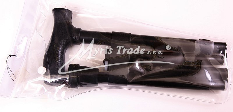 plně funkční vycházková hůl z tvrzeného kovu, kterou lze libovolně nastavit do požadované délky a složit do pouzdra, ve kterém je dodávána