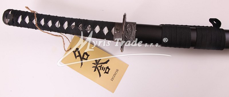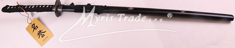 levná, ale kvalitní samostatná ocelová katana s pochvou v barvě černé s asijskými znaky dovoz Španělsko