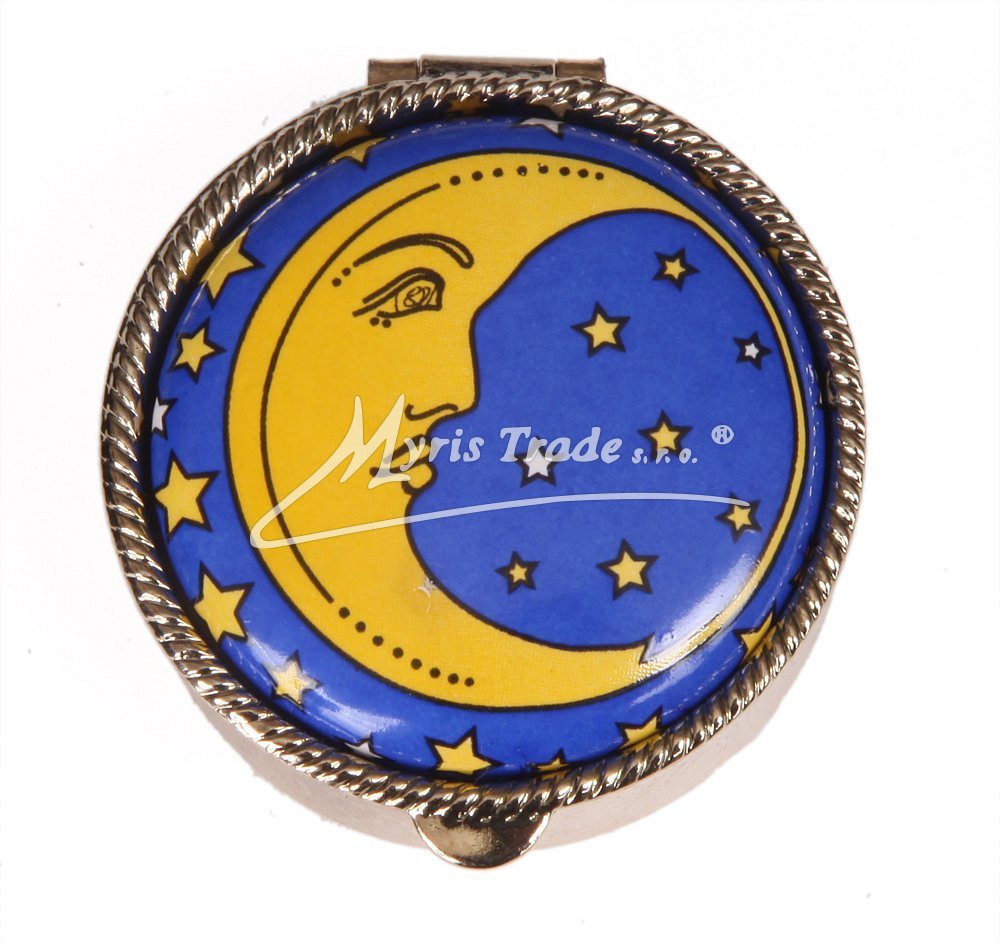 klasická kulatá lékovka je vyrobena z kovu zlaté barvy s porcelánovým víčkem s romantickým motivem