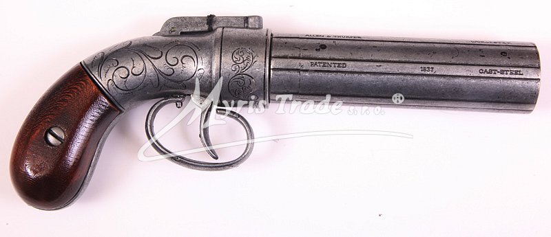 nefunkční replika historické šestirané atypické pistole s otočnou hlavní, ze dřeva a kovu v šedé barvě