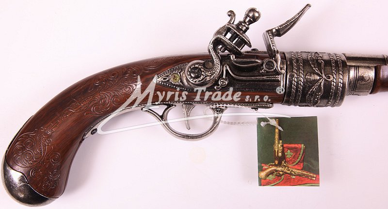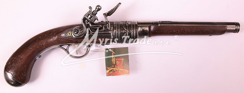 luxusně provedená nefunkční replika historické křesadlové pistole z dokonalé imitace dřeva a kovu stříbrné barvy