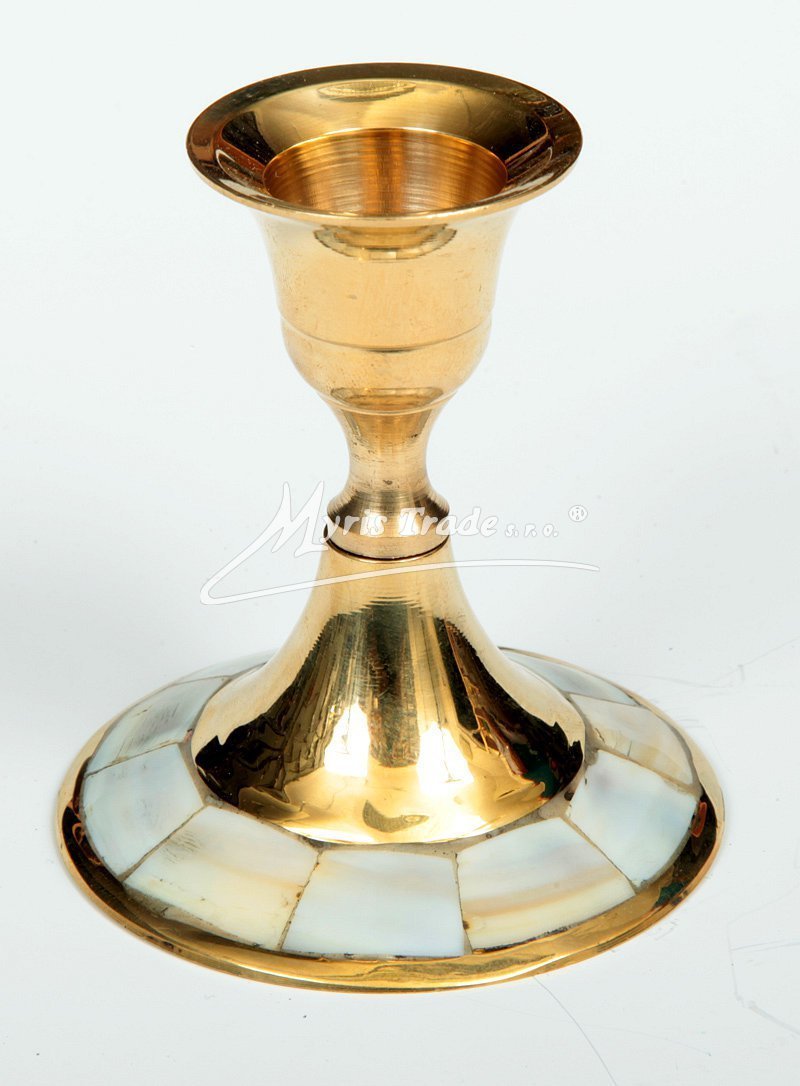 malý mosazný svícen zdobený perletí, na jednu svíčku