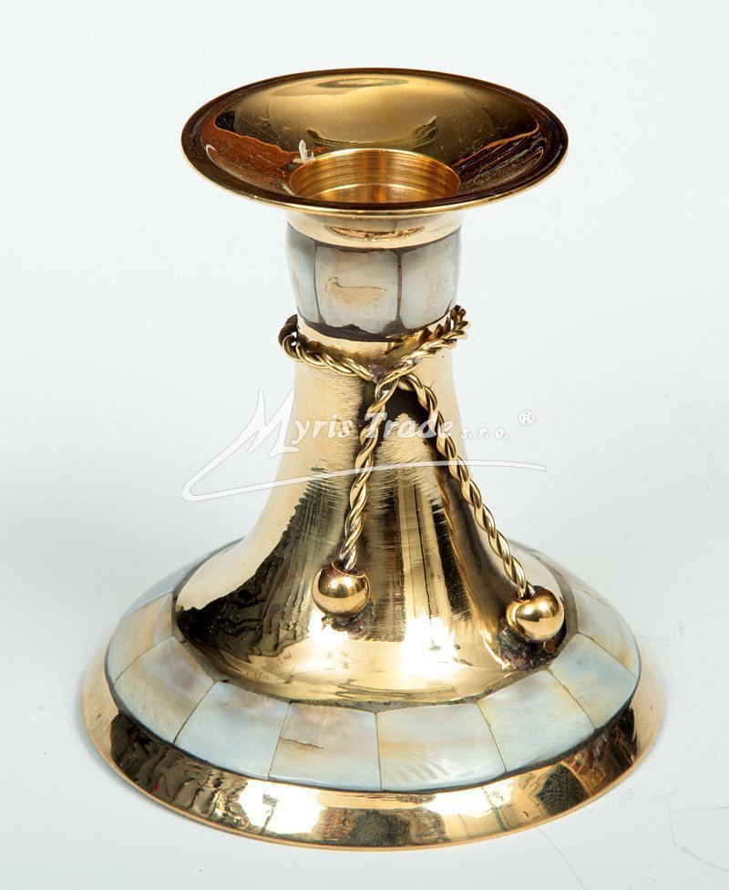 masivní střední mosazný svícen zdobený perletí, na jednu svíčku