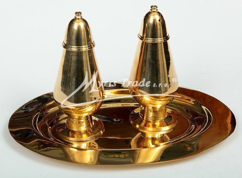 ozdobná mosazná stolní sada na pepř a sůl obsahující podtácek, slánku a pepřenku