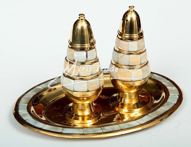 ozdobná mosazná stolní sada na pepř a sůl obsahující podtácek, slánku a pepřenku, zdobená perletí