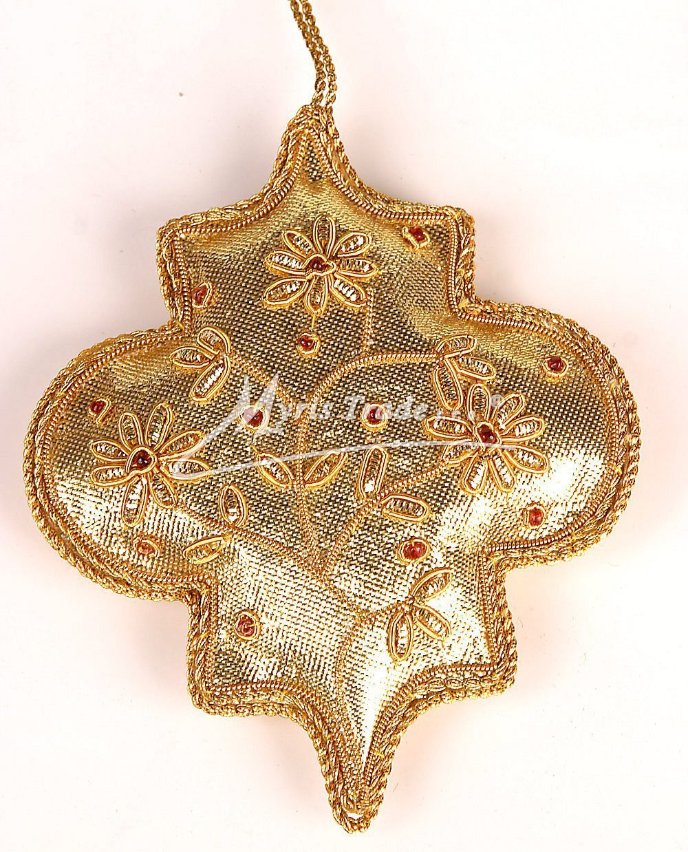 Textilní dekorace pošitá korálky. List může sloužit jako vánoční ozdoba, nebo i jako dekorace mimo vánoční sezónu. Je vyroben ze sametu a je ručně pošitý drobnými korálky a kovovým drátkem ve zlaté barvě.