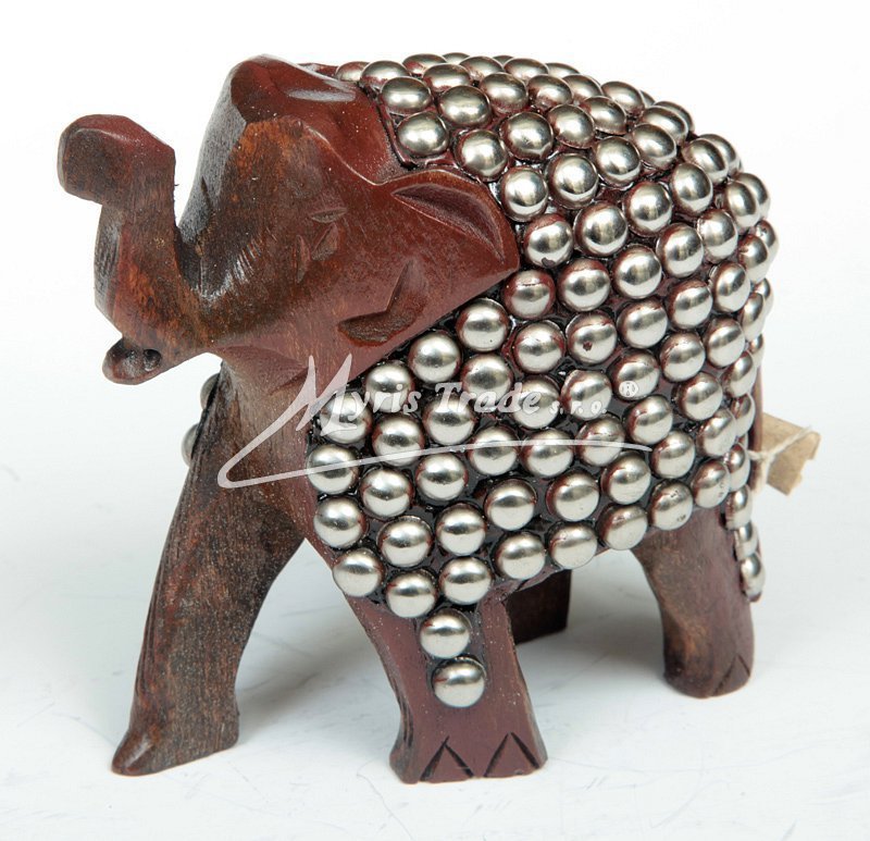 slon dřevěný - ručně vyřezávaný, tmavé dřevo, zdobený kovovými perličkami ve stříbrné barvě